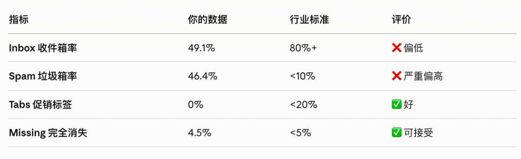 我这里看的是严格不合格的,因为 inbox 收件箱成功率才49.1%,至少要在70%以上才算合格,我这里用的阿里云企业邮箱,里边的 ip 大多被用来群发被各个邮箱服务器标记了